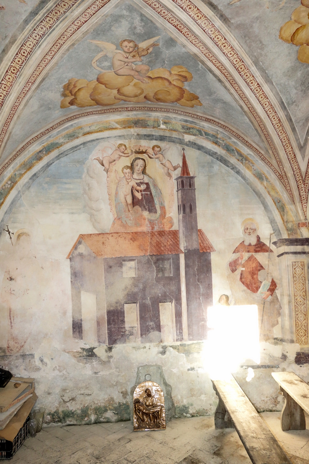 sulla parete di fondo Sant’Antonio abate tra San Giovanni Battista e un santo Vescovo, affresco datato 1539. |