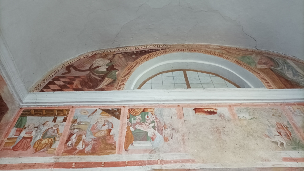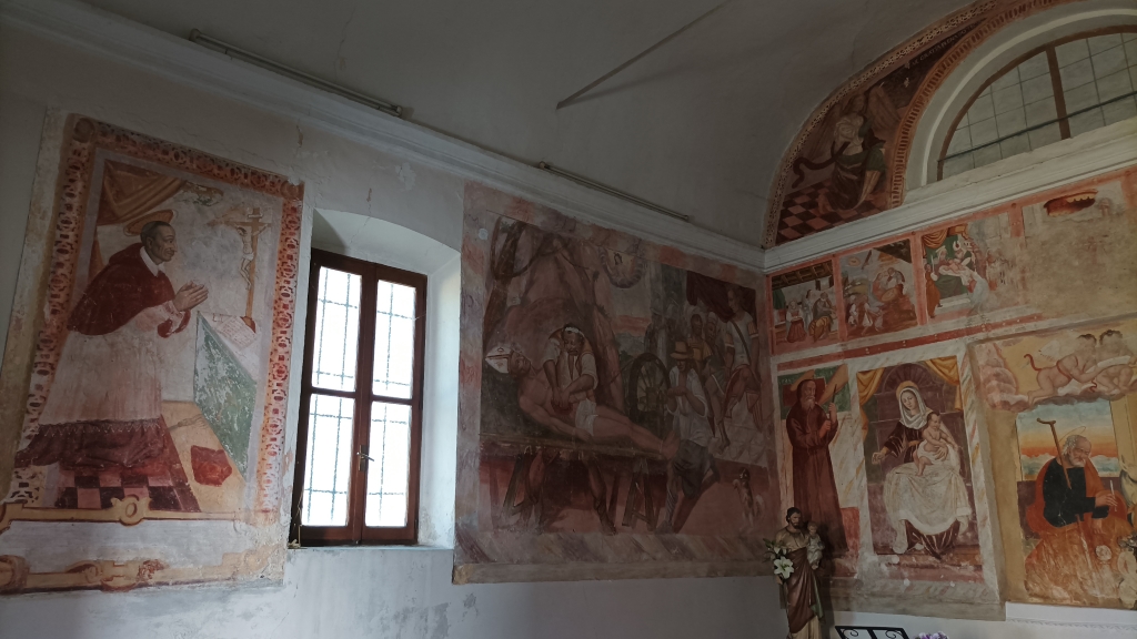 Interno: quasi completamente decorato con affreschi di diversi autori del tardo '500, pesantemente restaurati, di cui il più interessante è l'Annunciazione dell'arcata superiore con l'angelo a sinistra, la Madonna in preghiera a destra e al centro una finta finestra. |
