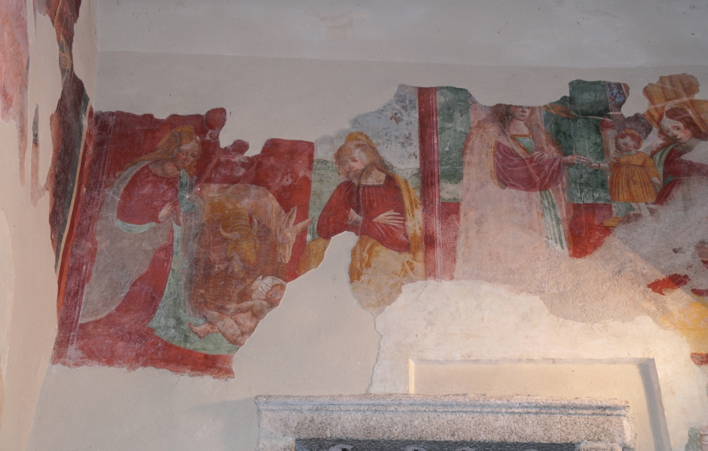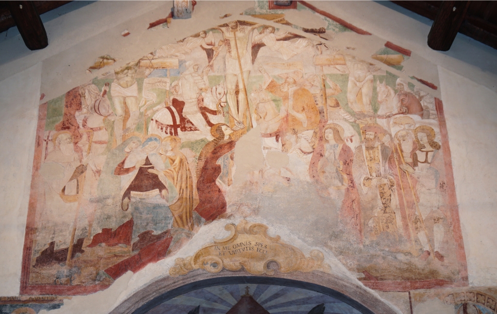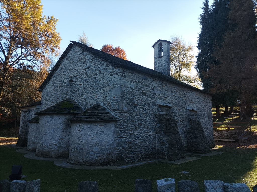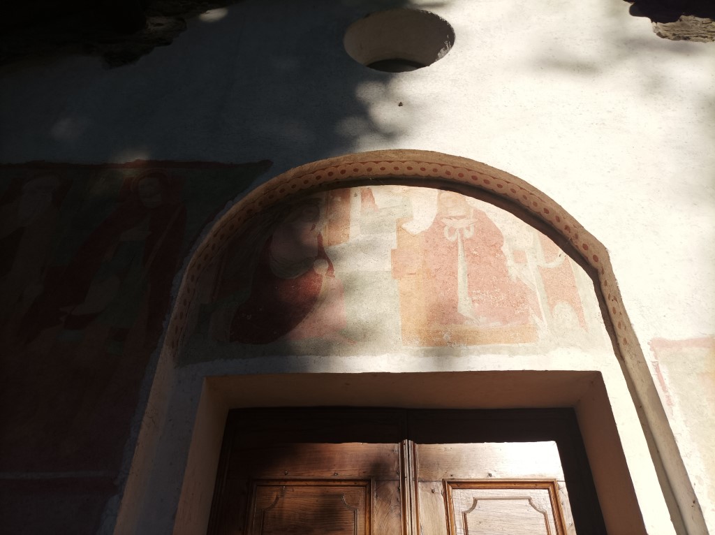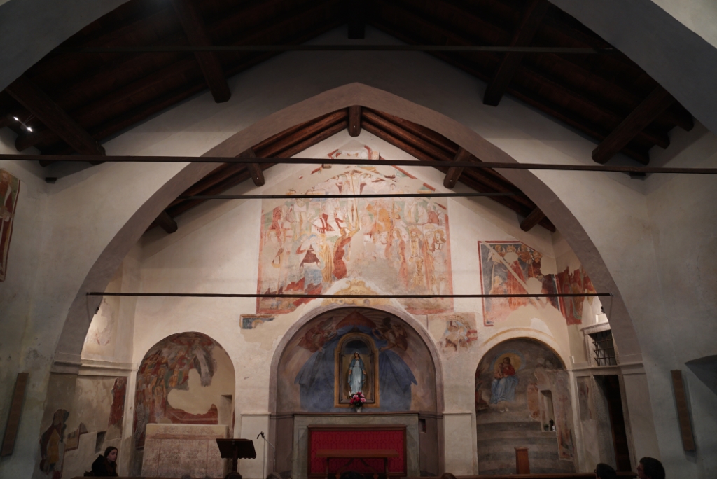 Esterno: facciata ricoperta di affreschi del '400 e '500 tra cui San Cristoforo di notevoli dimensioni, San Giulio con Sant'Antonio e San Rocco; nella lunetta Annunciazione con Santa Chiara e Santa Caterina, Maria in Trono con San Giulio e San Rocco, San Francesco con la Maddalena e la Beata Panacea. Tre interessanti absidi semicircolari si innestano su un'unica navata e sono aperte da rozze monofore e costruite in ciottoli disposti in corsi irregolari. |