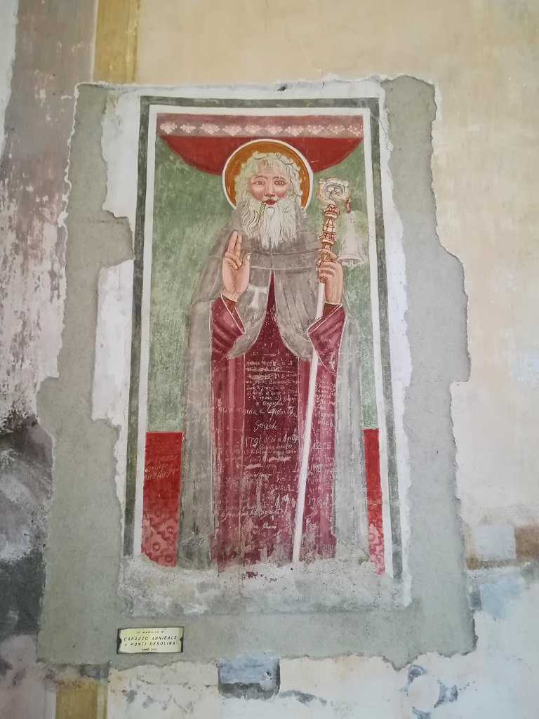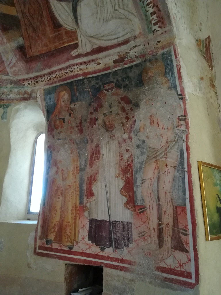 Interno: affreschi, tra cui una Madonna del Latte col Bambino, un San Sebastiano e San Dionisio con Santa Lucia e un Sant'Antonio Abate. |