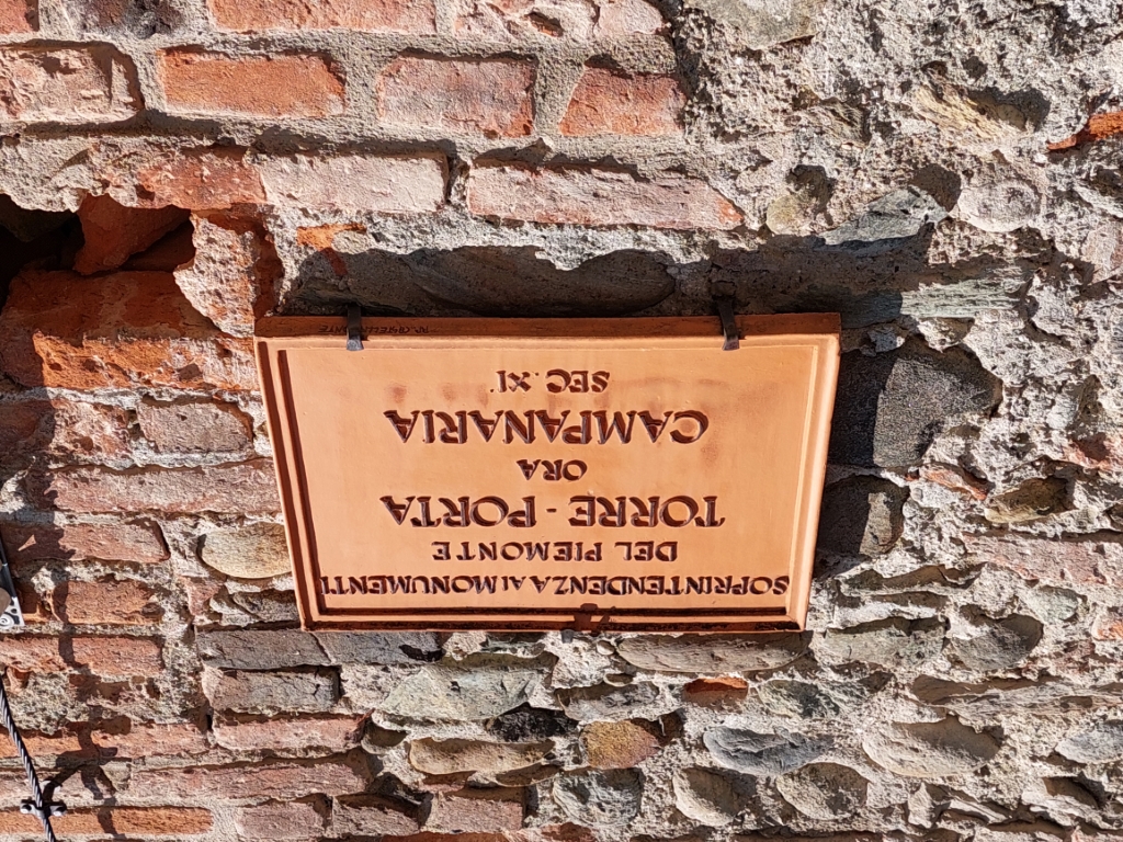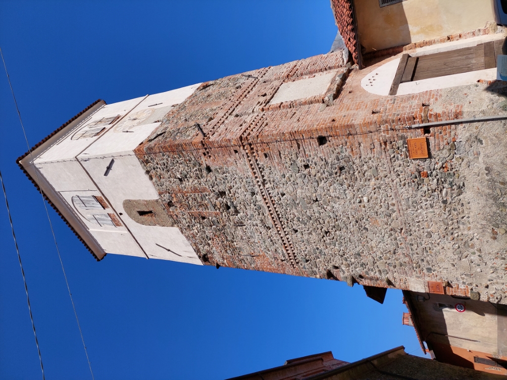 Campanile: la torre-porta fungeva da passo carraio con una doppia chiusura: a Sud con ponte levatoio, a Nord con cantoni di legno imperniati su cardini litici, innestati alla base di un arco in cotto di stile Romanico. Quando venne trasformata in campanile (probabilmente all'inizio del XVIII° secolo), le due porte vennero trasformate nell'attuale configurazione che consiste nel tamponamento parziale con muratura della porta Sud e nella creazione di una scala in pietra di accesso ai piani superiori -sede delle campane- sul lato Nord. |