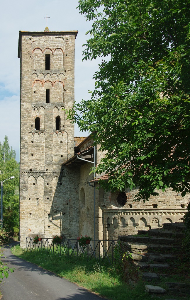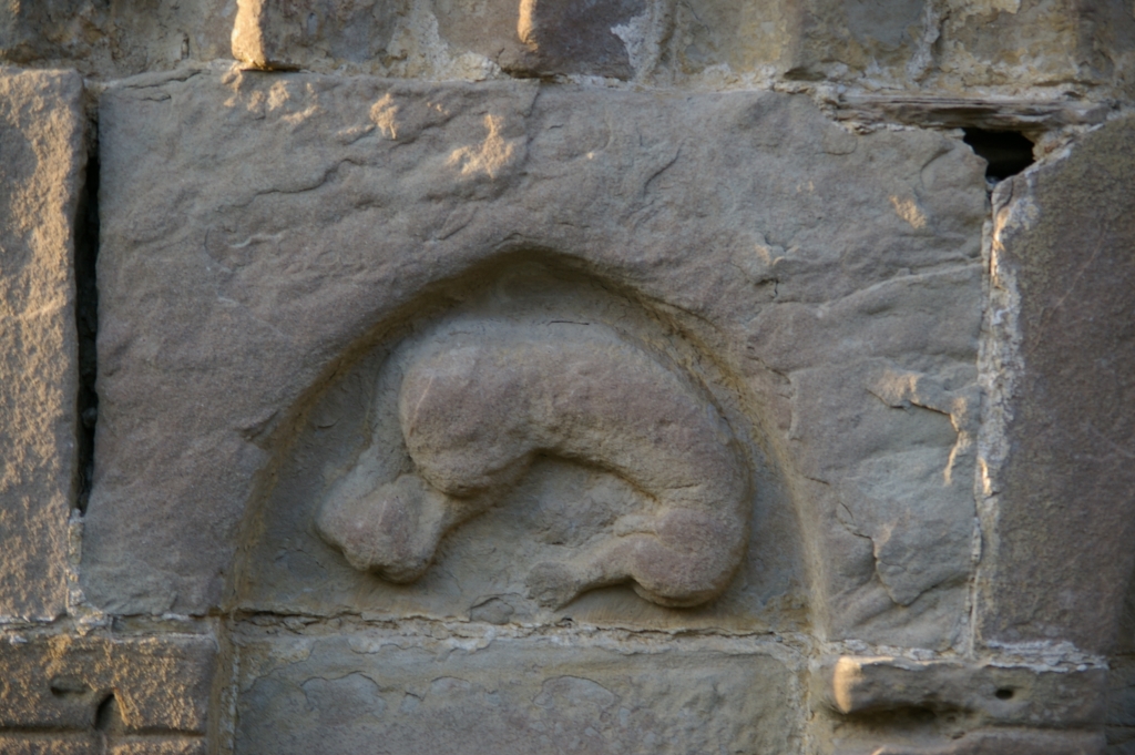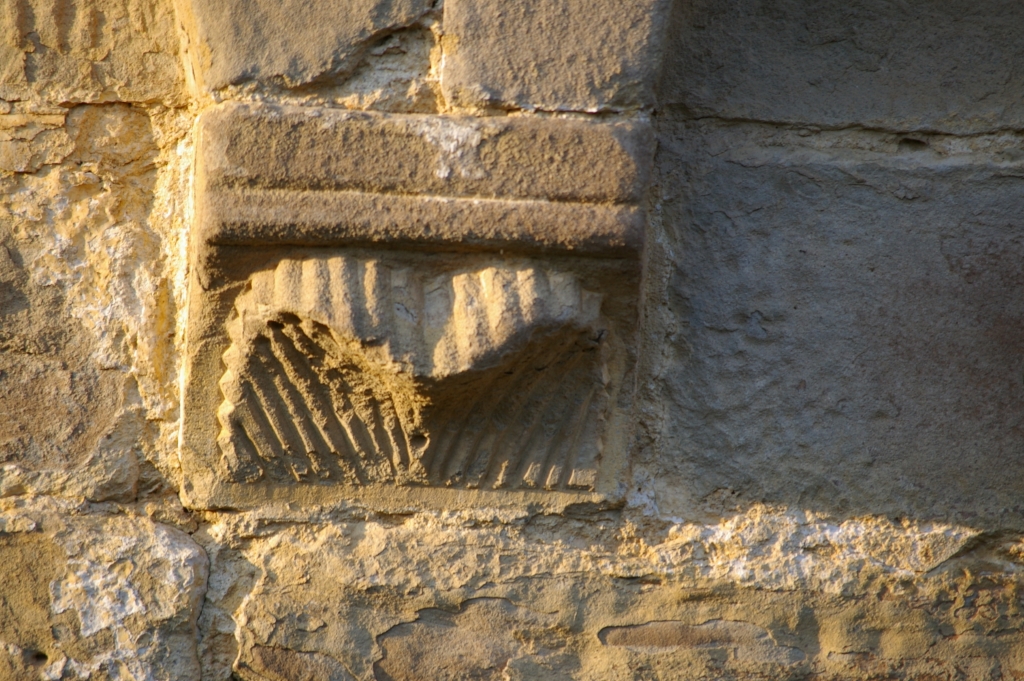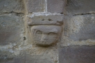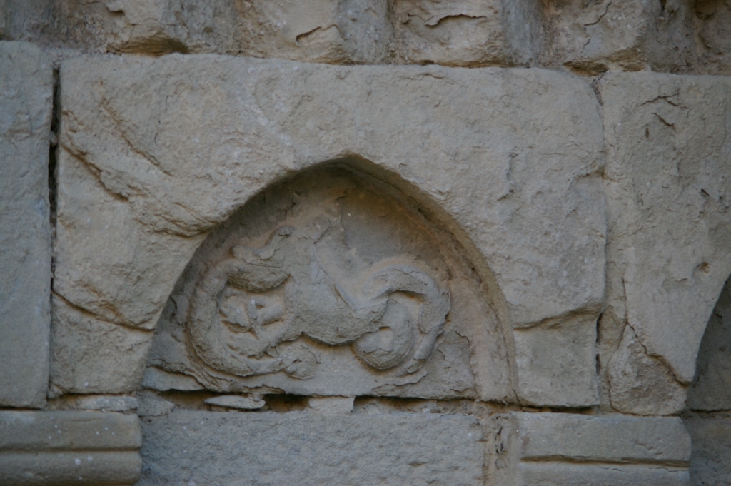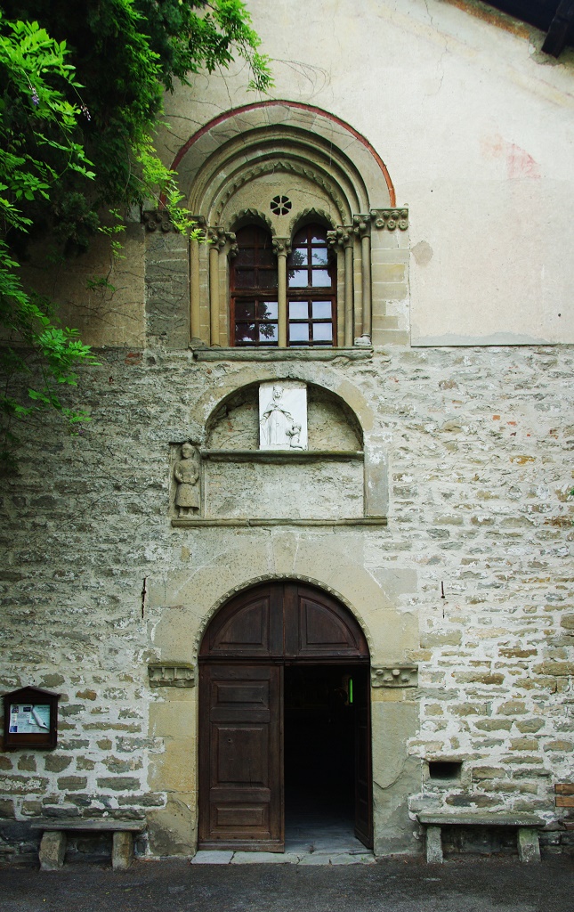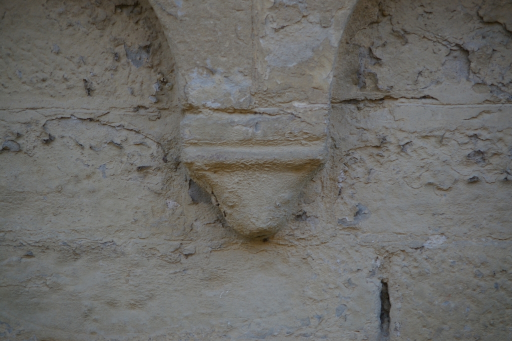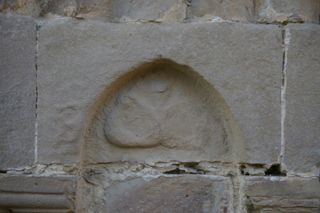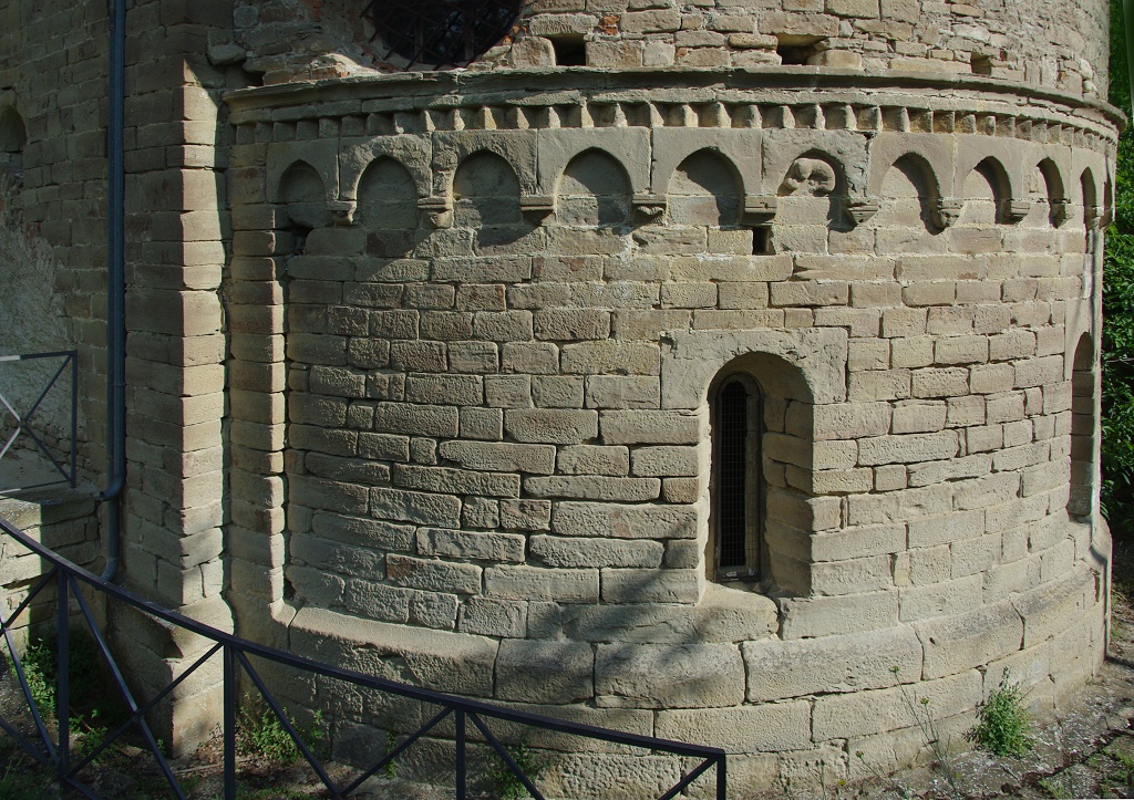 Esterno: bifora sulla facciata con resti di affreschi e abside in arenaria decorata con archetti pensili a sesto acuto e motivo a denti di sega. |