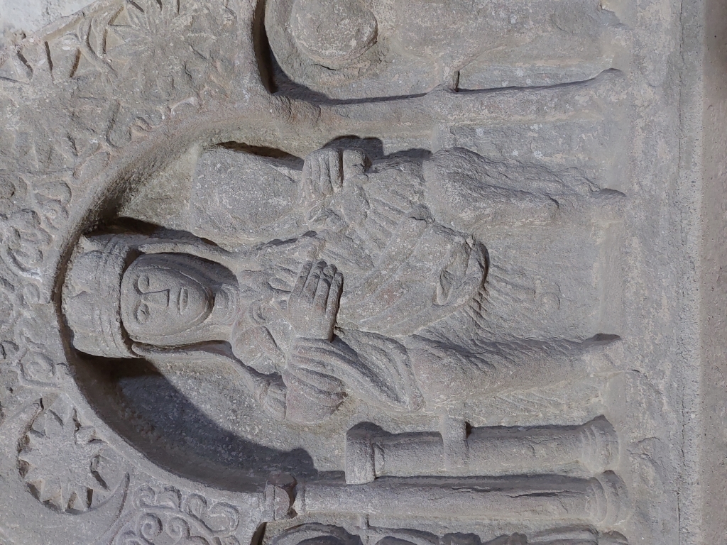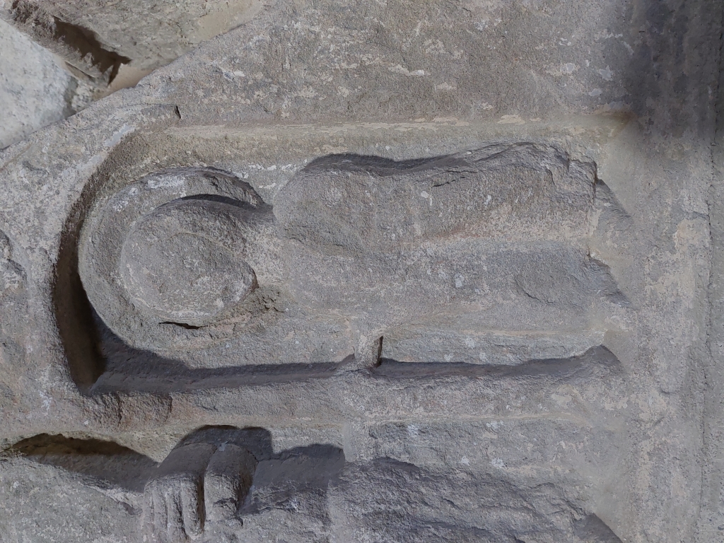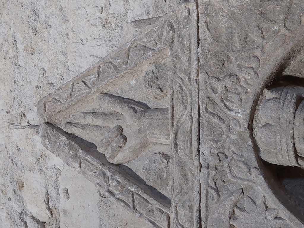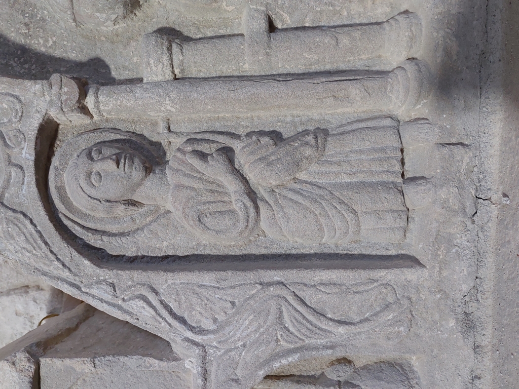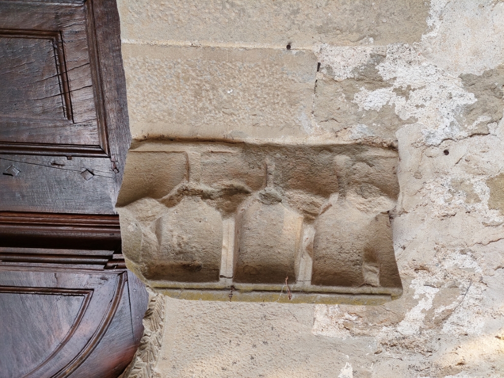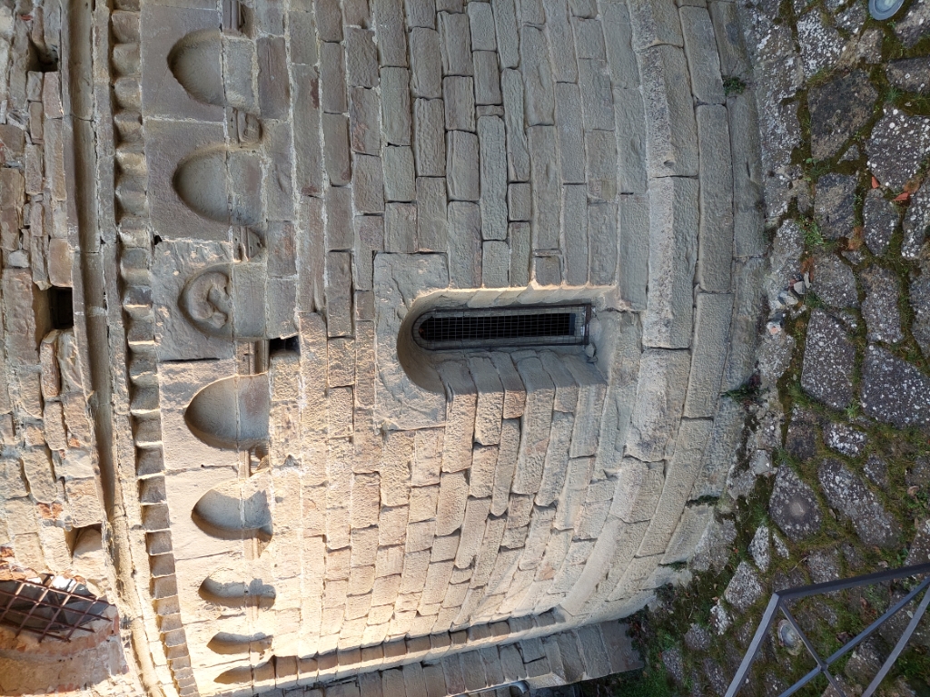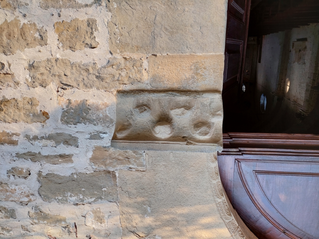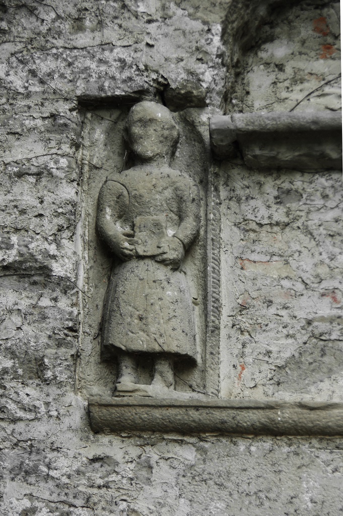 Esterno: bifora sulla facciata con resti di affreschi e abside in arenaria decorata con archetti pensili a sesto acuto e motivo a denti di sega. |