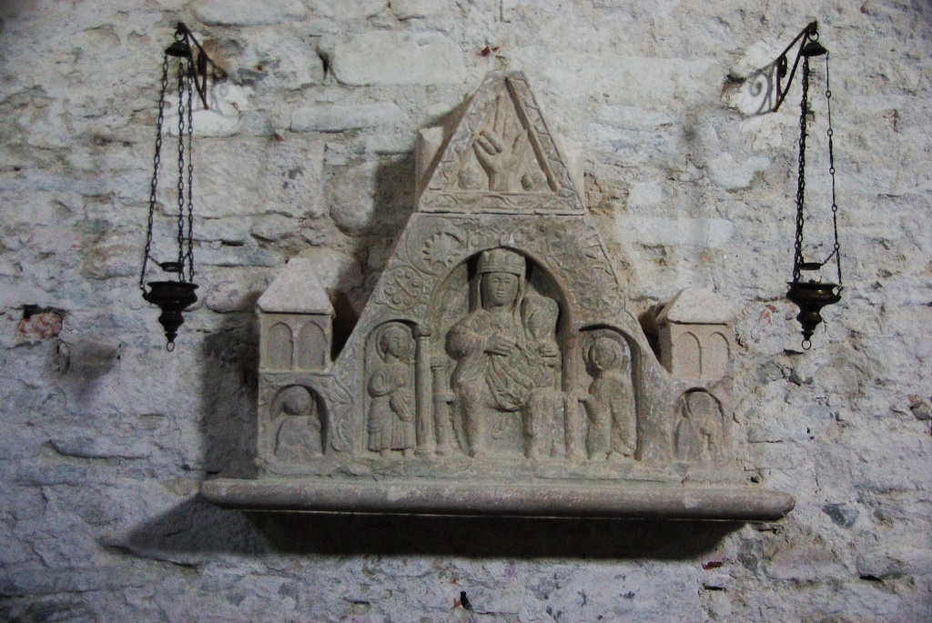 Interno: a una navata con alla parete sinistra trittico medioevale in pietra, altomedioevale forse del VII secolo, raffigurante la gloria della Vergine. |