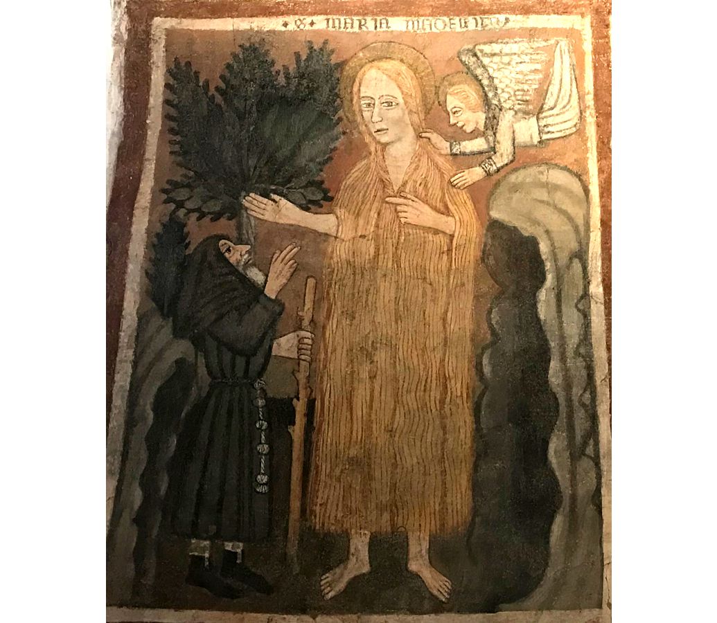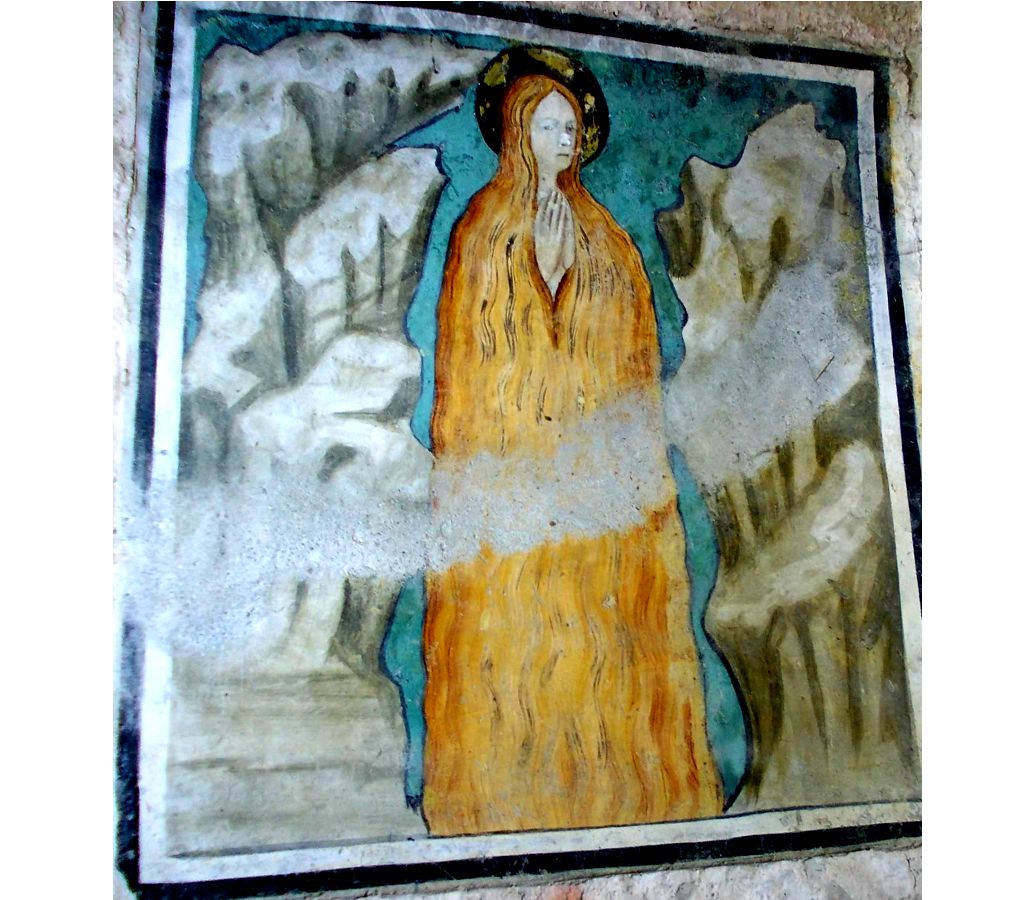 Raffigurata ai piedi della croce o come penitente in una grotta.