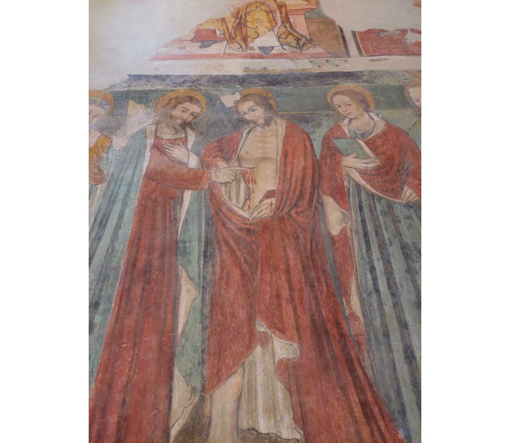 tunica blu e mantello rosso. Inoltre può essere rappresentato con il dito verso l’alto nell’intento di indicare Gesù; questo fa riferimento all’episodio che evidenzia l’incredulità di Tommaso nella