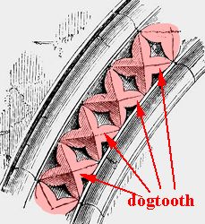 scalpello tozzo usato dagli scultori per lavorare a fondo la pietra, ma anche fregio del protogotico (dog-tooth) costituito da una serie si stellette a 4 punte, poste diritte e composte a piramide. |