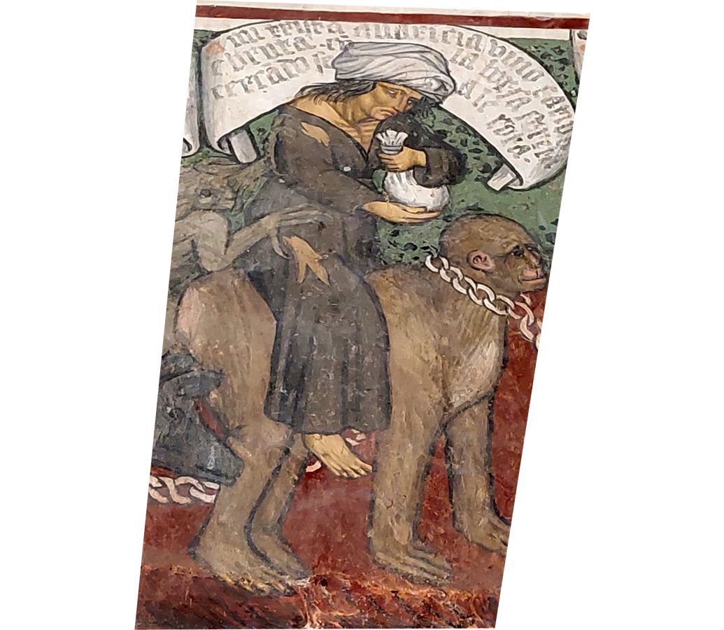 Gli animali possono essere una scimmia, un orso, un cavallo. Un tasso, un cinghiale, un maiale, un cane, spesso un levriero,